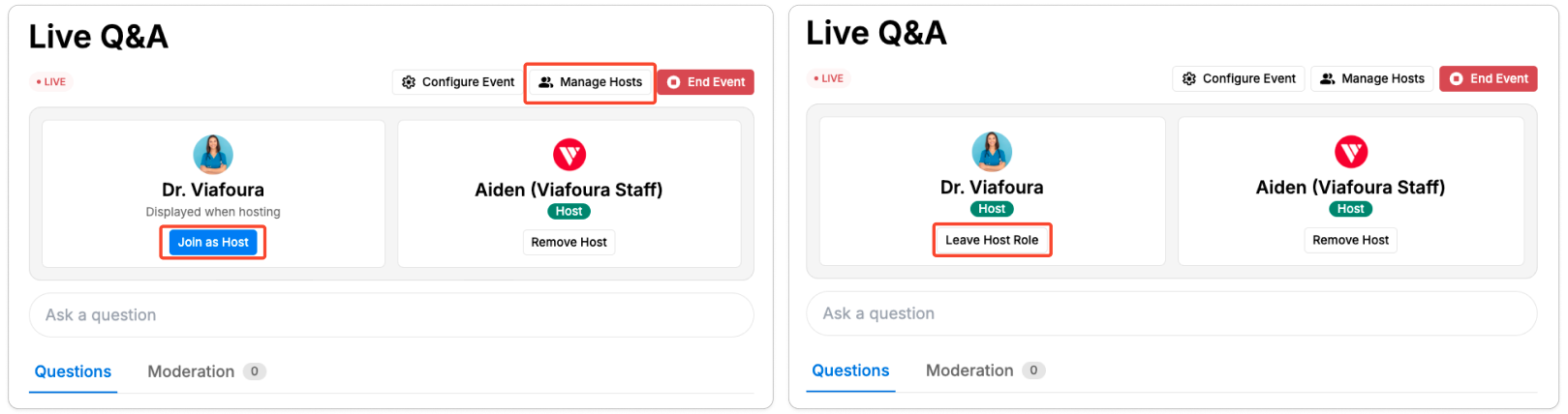 Once joined, the user will appear publicly as a host for that Live Q&A event and will be able to participate with host privileges (answering questions).