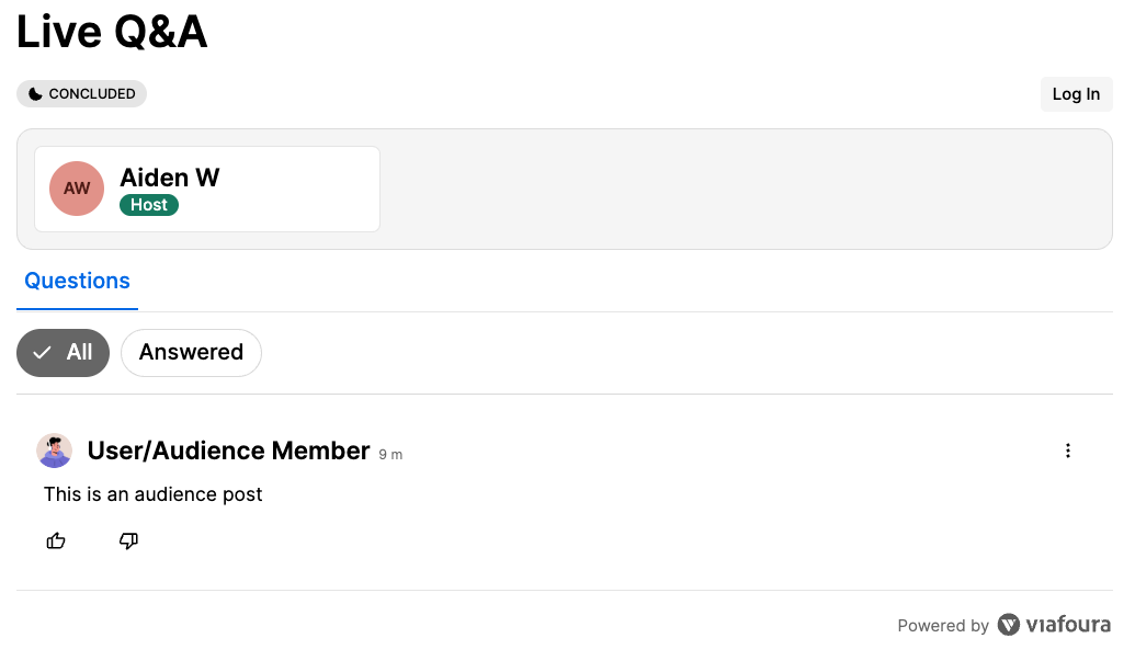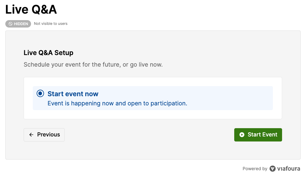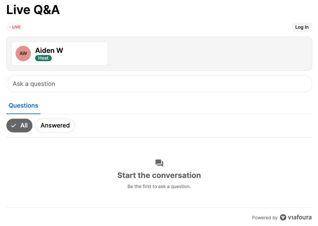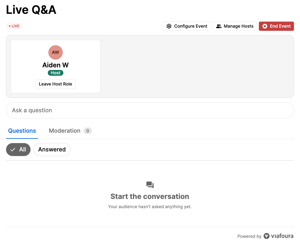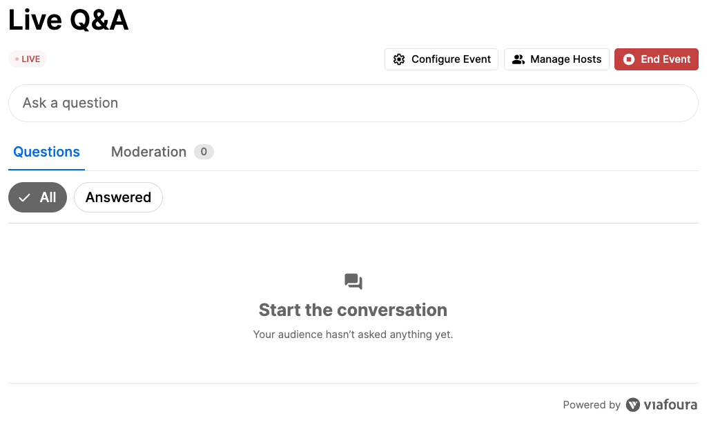 Once the event setup is successfully completed ('Start Event'), the Live Q&A will initialize and become visible to your audience with the event in Live state.
