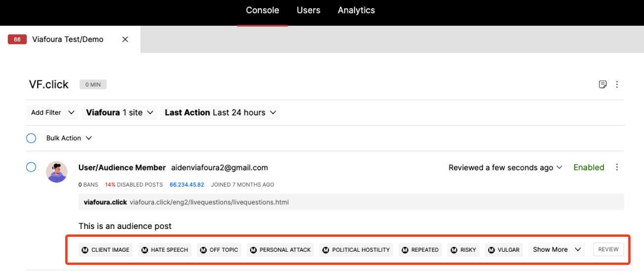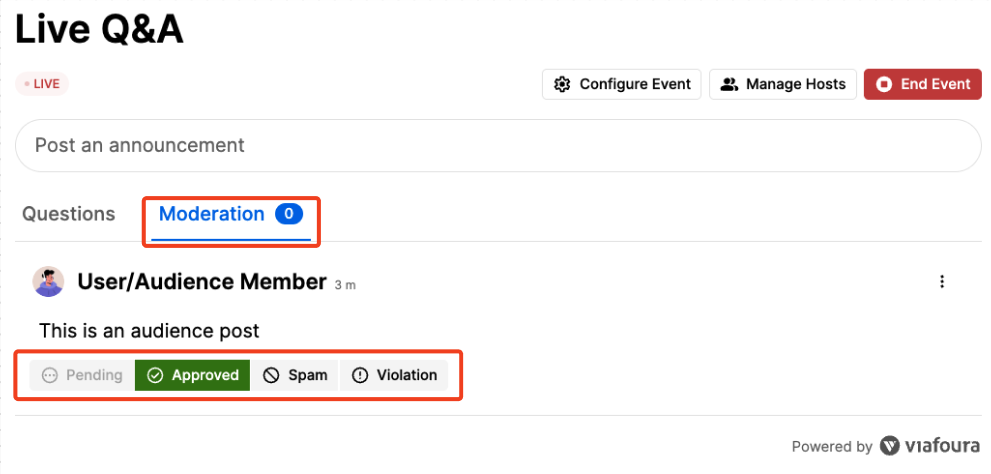 - Moderators can override any automated decision through manual actions in the Live Q&A moderation tab or Viafoura moderation console.