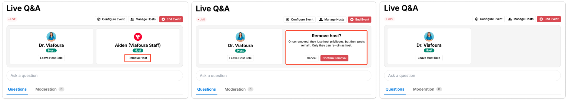 Authorized staff, moderator, and admin users can also remove any host from the event’s host list when needed. This is useful if a planned host is no longer available to participate, such as in cases of illness or a scheduling change.