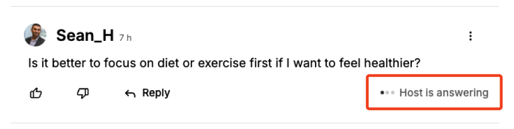 When a host begins replying to a question, a Host is answering indicator appears on the post. This lets the audience know that the question is actively being addressed in real time and helps encourage users to stay engaged while the response is being prepared.
