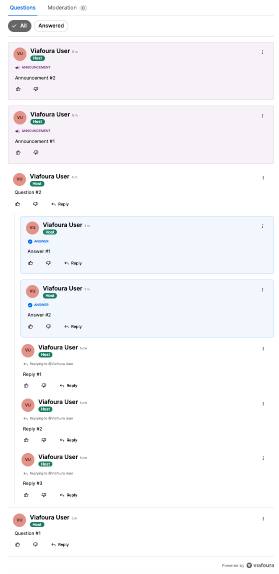 - When a host answers a question, the question (and its nested replies) will also be found in the Answered view.