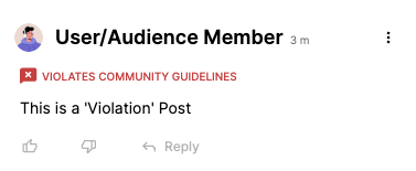 | Violation | Not Published: The post is flagged for violating site or community guidelines. | “VIOLATES COMMUNITY GUIDELINES" | ![]() |