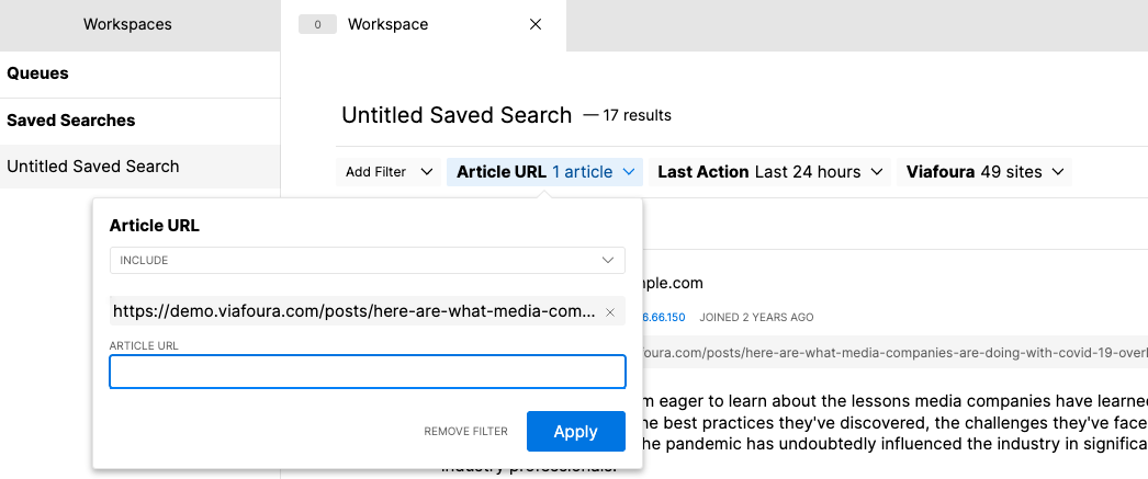 - Paste in the Article URL (you can add multiple), you can also combine this search with the Comment Status filter to show only comments that have been enabled