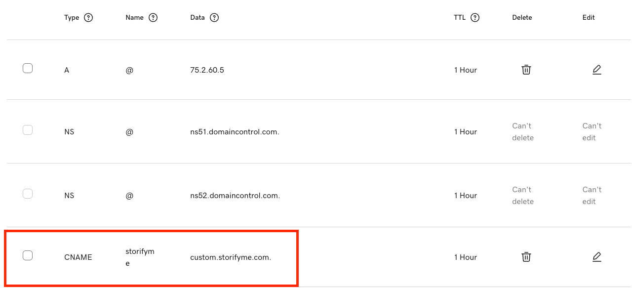 Step 2 - When you add the domain in StorifyMe you will be shown a CNAME entry to add to your domains DNS settings, add that entry to your DNS.
