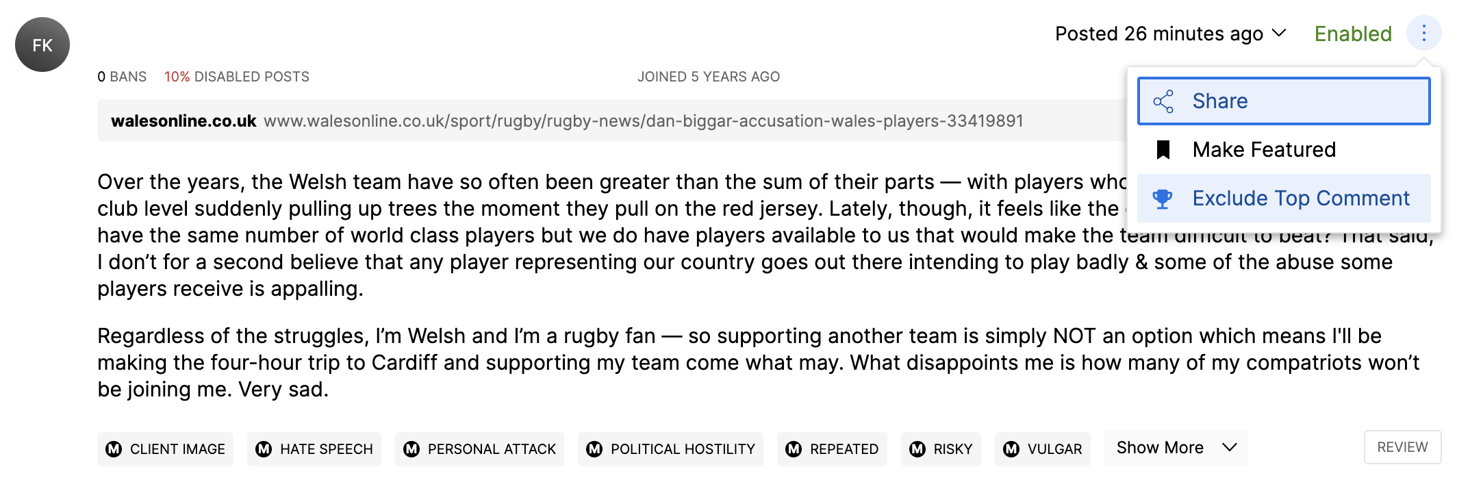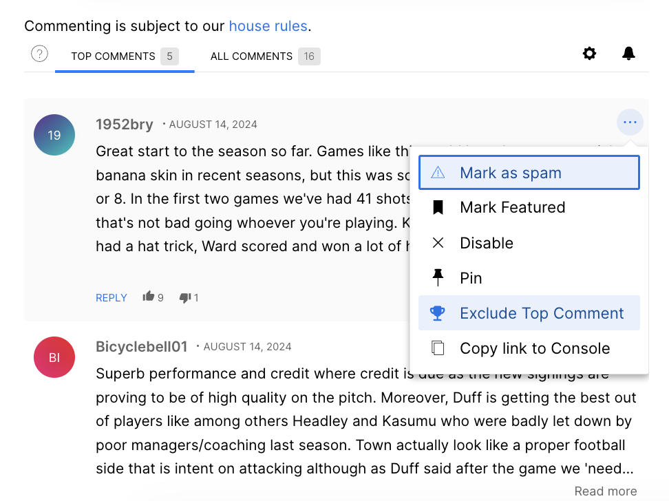- Manual Control: Moderators and staff can manually exclude specific comments from the "Top Comments" tab via the on-site moderation menu or in the moderation console